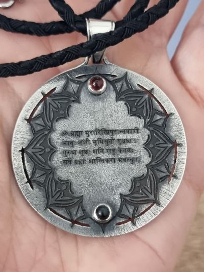 На обороте выгравирована мантра Наваграха стодхам, призывающая силу всех девяти планет одновременно. Камни начинают действовать на эфирном плане, привнося астральный свет планет в материю и восстанавливая баланс вашей ауры через священную геометрию творения.