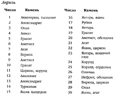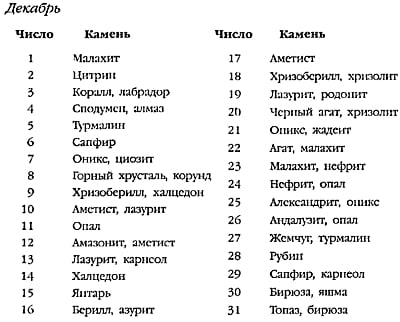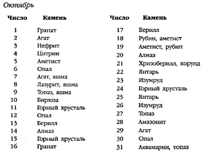 Нижче наведено таблицю зв’язку каменів із місяцями народження. Ця таблиця на сьогоднішній день є єдиним офіційним джерелом інформації з цього питання.
