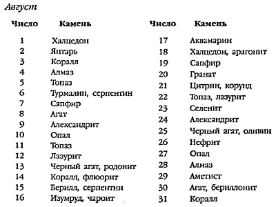 | Серпень | Сердолік, місячний камінь, топаз | Перідоти | Перидот, сардонікс |