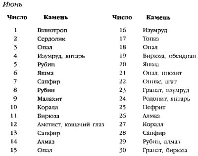 - Сприятливі камені за датою народження: адуляр, амазоніт, геліо-троп, перли, смарагд, котяче око, місячний камінь, перламутр, селеніт, спесартин, азур-малахіт, акбар, арагоніт, гагат, гемагат, ксиліт, алмаз, матрикс стефанік, хризоберил, шорломіт, аквамарин, апірит, верделіт, корал, кунцит, морганіт, хмарний халцедон, перистерит, плазма, рубеліт, чароїт.