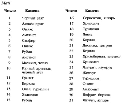 | Травень | Агат, смарагд | Смарагд | Смарагд, хризопраз |