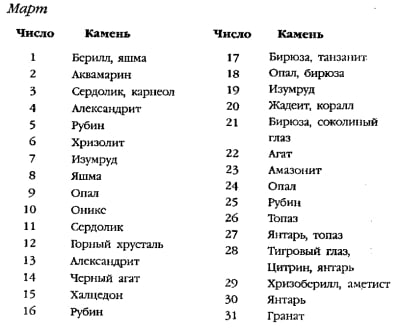 | Березень | Гематит, яшма | Аквамарин, гематит, | Гематит, аквамарин |
